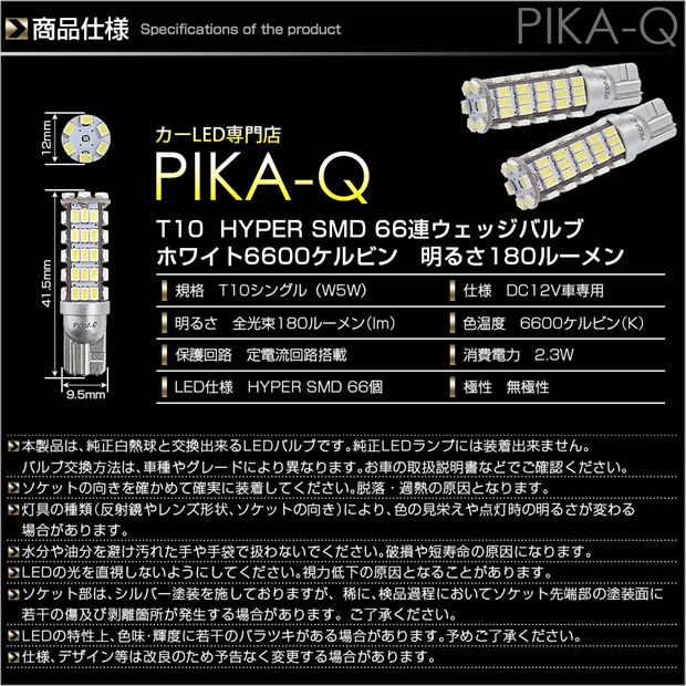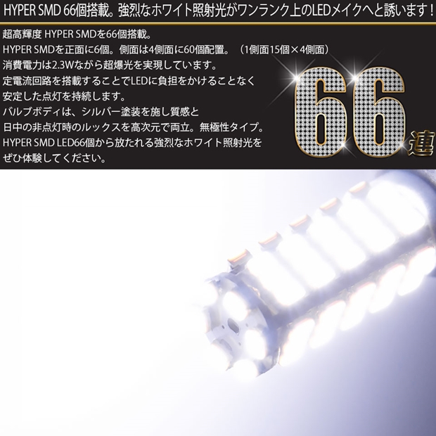 目立ち度は抜群のT10ウェッジバルブです。 高輝度 HYPER SMD LEDを66個搭載。正面に6個・側面に60個(1側面15個×4側面)搭載。消費電力は2.3Wながら超爆光を実現しています。