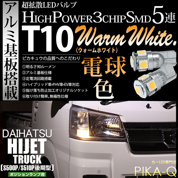 ダイハツ ハイゼットトラック (S500P/S510P 後期) 対応 ポジションランプ LED T10 5連 80lm ウォームホワイト 電球色 2個 2-B-10