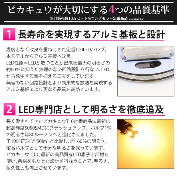 バルブ1球の明るさは80ルーメン(lm)。T10純正球(約50lm)と比較し約160%の明るさです。LED専門店として明るさを徹底追及し、T10定番バルブとして十分な明るさを保っています。