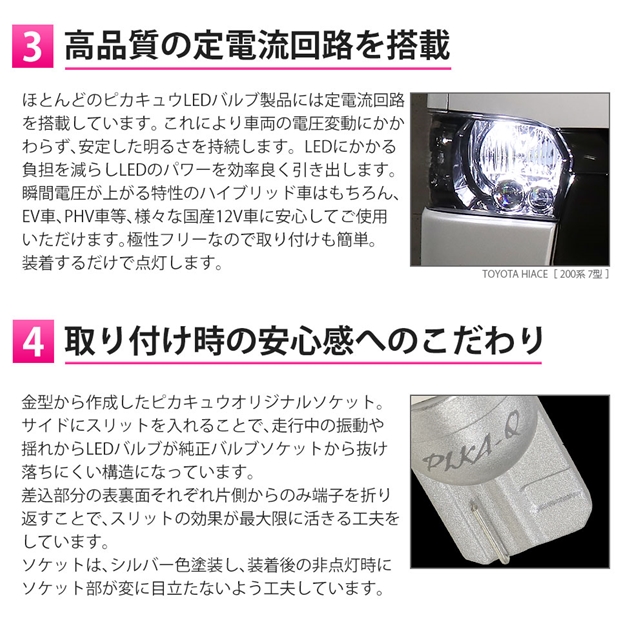 定電流回路を搭載し、車両電圧の上下に影響されることなく安定した点灯を持続します。LEDにかかる負荷を抑え、より長寿命を実現しております。 ハイブリッド車、EV車、PHV車等、さまざまな国産12V車に安心して装着していただけます。