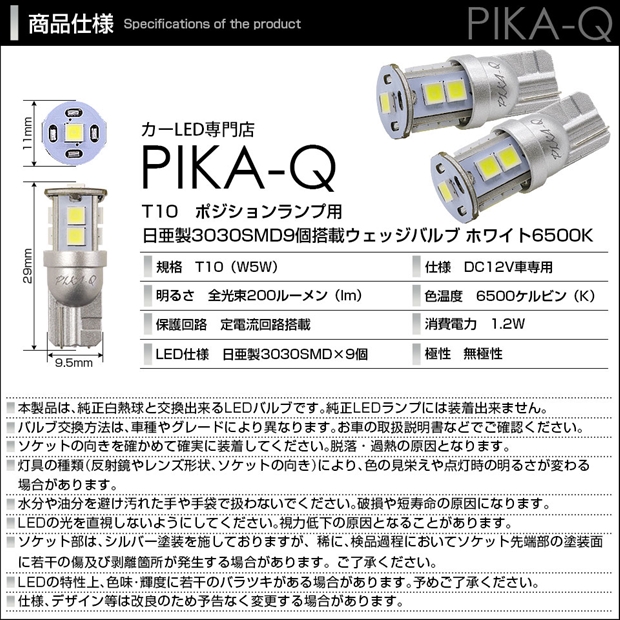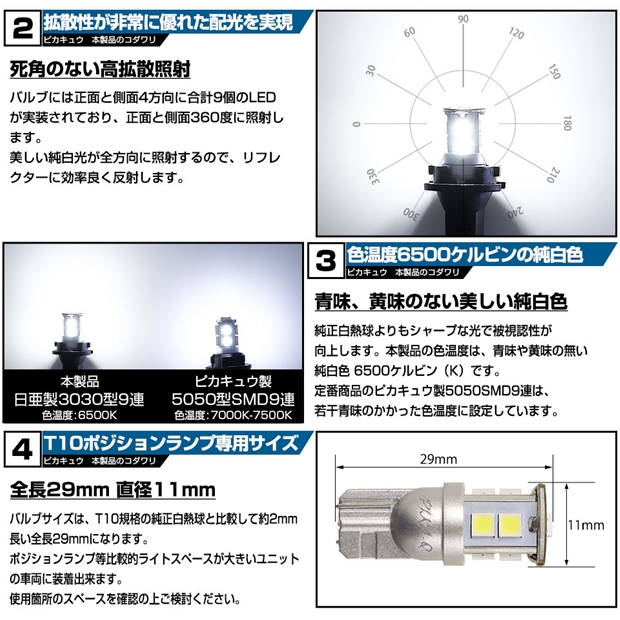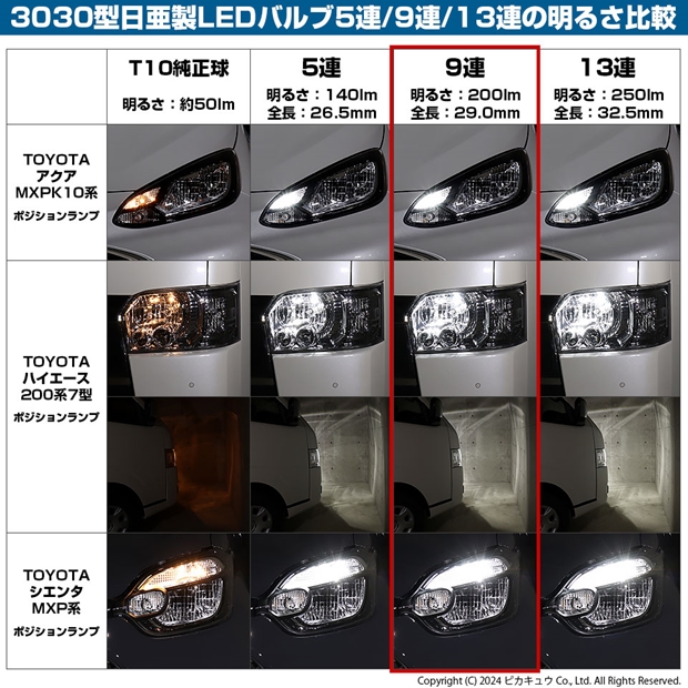 ダイハツ ハイゼットトラック (S500P/S510P 後期) 対応 ポジションランプ LED T10 9連 200lm ホワイト 日亜3030 6500K LED ウエッジバルブ 日亜化学工業製素子使用 2個 11-H-5