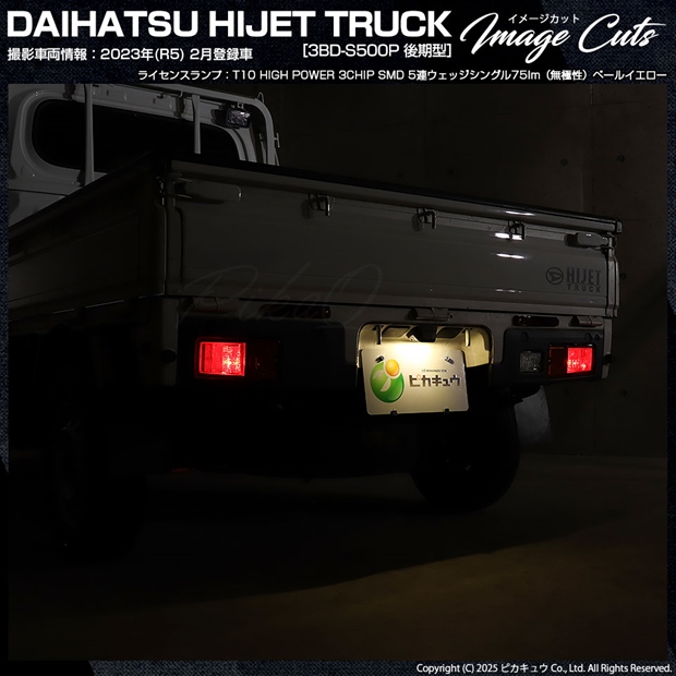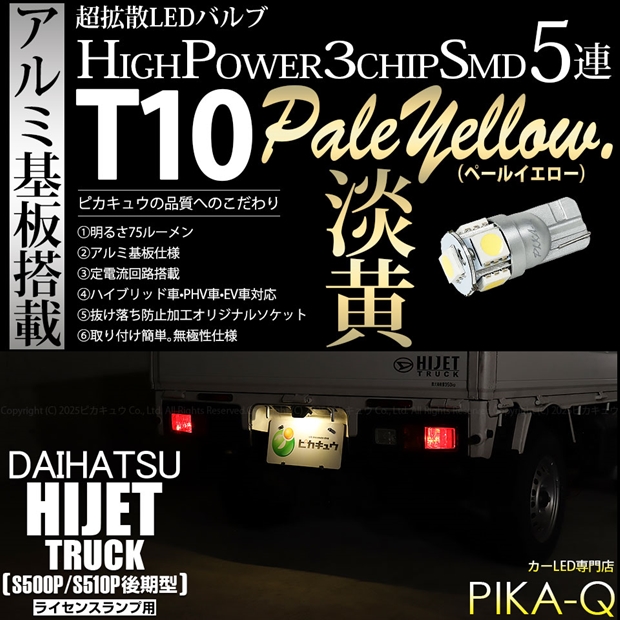 ピカキュウ,LED専門店,LEDバルブ,LED,SMD,T10,W5W,T10 HIGH POWER 3CHIP SMD 5連ウェッジシングル球,ペールイエロー,ライセンスランプ,番号灯,スズキ,ダイハツ,DAIHATSU,ハイゼット,ハイゼットトラック,HIJET TRUCK,S500P,S510P