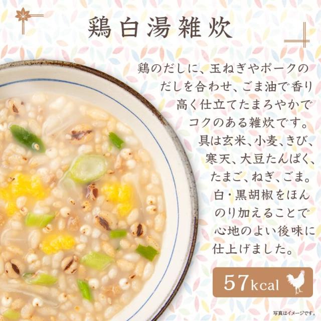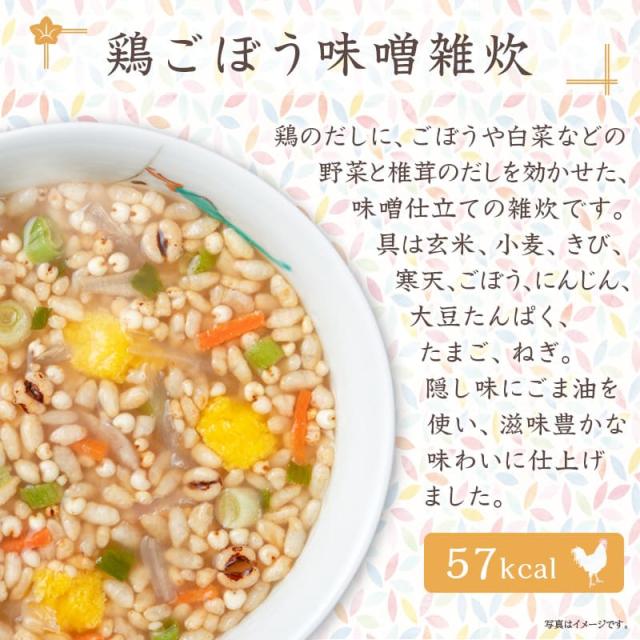 | 【かにだし味噌雑炊(1食(16.3g)あたり)】エネルギー 59kcal、たんぱく質 2.9g、脂質 0.8g、炭水化物 9.9g、食塩相当量 1.0g 【鶏ごぼう味噌雑炊(1食(16.1g)あたり)】エネルギー 57kcal、たんぱく質 2.1g、脂質 0.5g、炭水化物 11.2g、食塩相当量 1.0g 【鶏白湯雑炊(1食(15.3g)あたり)】エネルギー 57kcal、たんぱく質 2.2g、脂質 1.0g、炭水化物 9.8g、食塩相当量 1.0g 【鯛だし雑炊(1食(14.2g)あたり)】エネルギー 49kcal、たんぱく質 2.1g、脂質 0.4g、炭水化物 9.2g、食塩相当量 1.1g 【かつおだし雑炊(1食(13g)あたり)】エネルギー 44kcal、たんぱく質 1.6g、脂質 0.2g、炭水化物 9.1g、食塩相当量 1.0g |