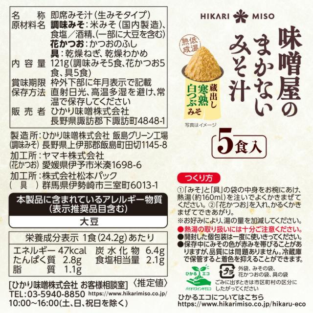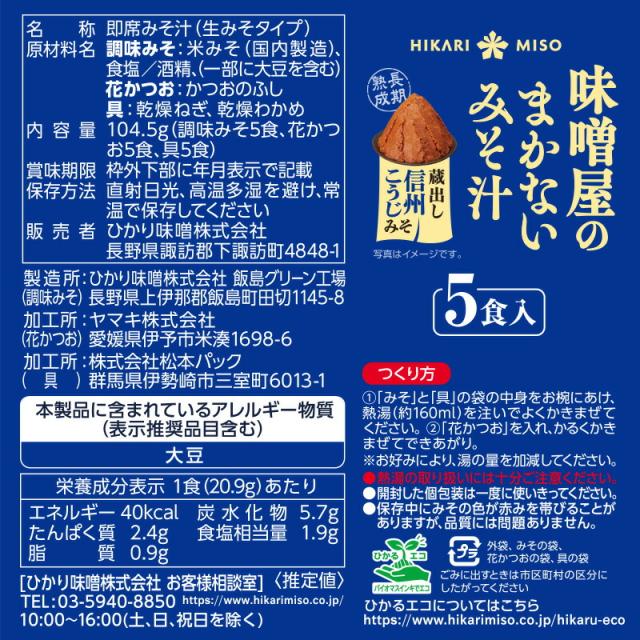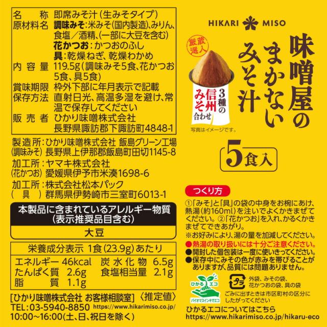 | ■信州こうじみそ ●名称:即席みそ汁(生みそタイプ) ●原材料名: 【調味みそ】米みそ(国内製造)、食塩/酒精、(一部に大豆を含む) 【花かつお】かつおのふし 【具】乾燥ねぎ、乾燥わかめ ●内容量(1袋あたり):104.5g(調味みそ19g×5食、花かつお1g×5食、具0.9g×5食) ●商品説明: 年に一回の伝統行事である大寒仕込みを経て、蔵で三年以上じっくり熟成させた天然醸造味噌󠄀を使用しました。芳醇な香りと力強い旨み、ほのかな甘みをお楽しみください。 ■3種の信州みそ合わせ ●名称:即席みそ汁(生みそタイプ) ●原材料名: 【調味みそ】米みそ(国内製造)、食塩/酒精、(一部に大豆を含む) 【花かつお】かつおのふし 【具】乾燥ねぎ、乾燥わかめ ●内容量(1袋あたり):87g(調味みそ15.5g×5食、花かつお1g×5食、具0.9g×5食) ●商品説明: 滑らかな口当たりの信州こし味噌を黄金バランスでブレンドし、ほんのり甘くコク深い味わいに仕上げました。米麹をたっぷり使った甘口白味噌、大豆の旨みと芳醇で豊かな香りの赤味噌、そして素材の味が生きたすっきりとした味わいの淡麗味噌。それぞれに特徴的な3種の信州こし味噌に、隠し味としてみりんを一滴合わせることで、味噌の風味が濃厚でバランスのよい味わいの即席みそ汁が出来上がりました。 ■寒熟白つぶみそ ●名称:即席みそ汁(生みそタイプ) ●原材料名: 【調味みそ】米みそ(国内製造)、食塩/酒精、(一部に大豆を含む) 【花かつお】かつおのふし 【具】乾燥ねぎ、乾燥わかめ ●内容量:121g(調味みそ5食、花かつお5食、具5食) ●商品説明: 米麹をたっぷり使い、低温でじっくり熟成させた白粒味噌(12割麹)のおみそ汁です。 ●賞味期限:製造日より6か月 ●保存方法:直射日光、高温多湿を避け、常温で保存してください ●販売者:ひかり味噌株式会社 長野県諏訪郡下諏訪町4848-1 ●製造所:ひかり味噌株式会社飯島グリーン工場 (調味みそ)長野県上伊月瑯飯島町田切1145-8 ●加工所:株式会社松本バック (具)群馬県伊勢崎市三室町6013-1 /ヤマキ株式会社 (花かつお)愛媛県伊予市米湊1698-6 |