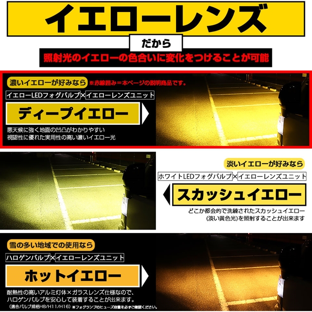 イエローレンズにLEDイエロー光を通すのでフォグの照射光は「濃いイエロー光=DEEP YELLOW」になります。イエローレンズなので非点灯時も抜群のアピール性を発揮します。