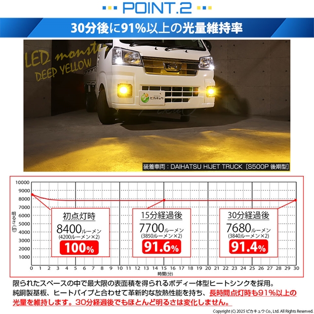 明るさ全光束8400ルーメンの最強のモンスターフォグランプLEDバルブです。放熱性能が高いため、長時間点灯後も91%以上の光量を維持します。30分経過後もほとんど明るさが変化しない放熱対策を施しています。純正球の配光特性に徹底的にこだわり、理想的な配光を実現しています。