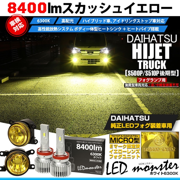 ダイハツ ハイゼットトラック (S500P/S510P 後期) 対応 H11 led MICRO LED MONSTER L8400 イエローガラスレンズ フォグランプキット 8400lm 白 44-H-4