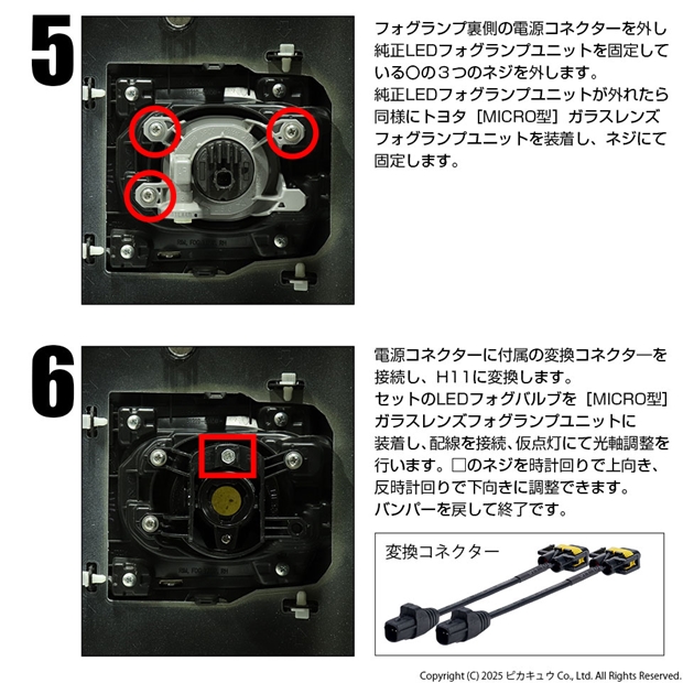 純正LEDフォグランプから明るいLEDフォグランプを装着出来るキットです。 本製品はトヨタ/ダイハツ車の純正フォグランプユニットから「イエローガラスレンズフォグランプユニット」に交換し、ピカキュウ人気モデル「LEDモンスター8400ルーメンフォグバルブ」を装着するキットです。
