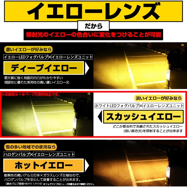 イエローレンズにLEDホワイト光を通すのでフォグの照射光は「淡いイエロー光=SQUASH YELLOW」になります。イエローレンズなので非点灯時も抜群のアピール性を発揮します。