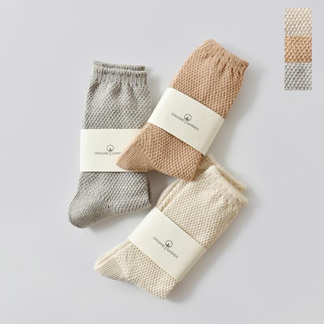 ORGANIC GARDEN(オーガニックガーデン)よりコットン 鹿の子編み ソックスのご紹介です。肌に心地よく寄り添う鹿の子編みソックス。独特の凹凸感が魅力の鹿の子編みは、通気性に優れ、ムレにくく快適な履き心地。オールシーズン心地よく過ごせる、シンプルで飽きのこないデザインです。