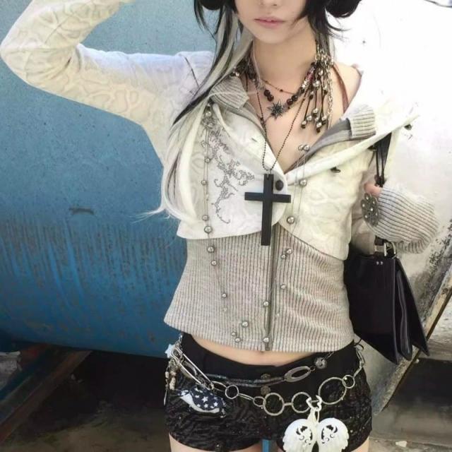 フード付きニットセーター レディース Y2K ジッパーカーディガン 長袖 pLegLad店 ストリートスタイル パンク V系 韓国ファッション 春 秋 地雷系 スリムフィットトップス