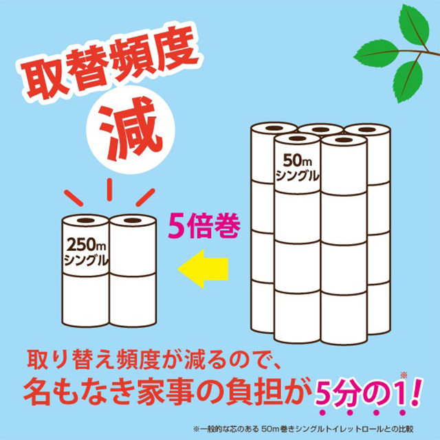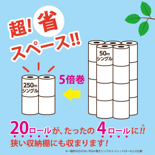 4人家族1ヶ月あたりのトイレットペーパーの消費量は、約16ロールといわれています(日本家庭紙工業会調べ)。『超ロング5倍巻き』なら、たったの4ロールで一般的なトイレットペーパー(※)の長さ20ロール分に相当します。もしもの時の備蓄品としてご家庭や職場にあれば安心です!