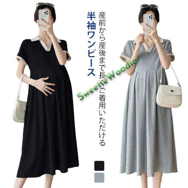 妊婦服 授乳服 半袖 マタニティウエア 薄手 ポロワンピース 産後 産前 半袖 ワンピース ロング 春夏 マタニティー 通気性 快適 柔らかい ゆった