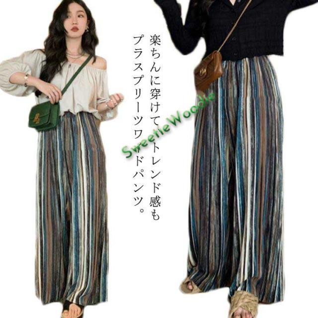 送料無料 プリーツパンツ ワイドパンツ レディース セルフカット プリーツ ロングパンツ イージーパンツ ウエストゴム ストライプ フレアパンツ 低身