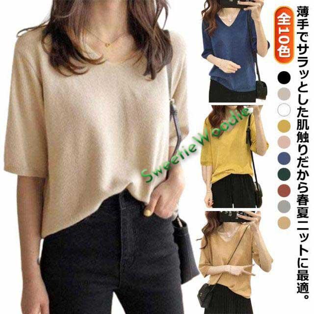 カットソー 通学 サマーニット レディース 薄手 七分袖 きれいめ ゆったり 大人女性 着〓せ ニット Tシャツ カットソー プルオーバー ニットセー