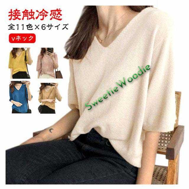 薄手 接触冷感 ニットセーター サマーニット 大きいサイズ レディース vネック 七分袖 全11色 プルオーバー ゆったり 半袖 レディース Tシャツ