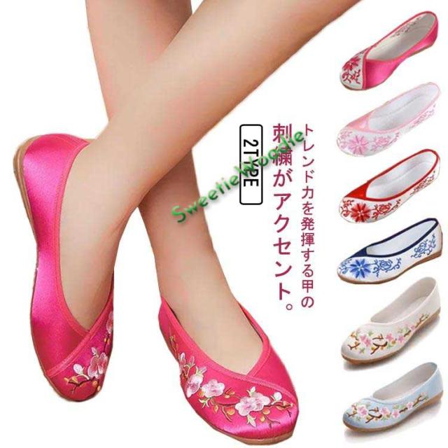 チャイナシューズ 刺繍パンプス 台湾シューズ サテン 中華風 刺繍シューズ パンプス ローヒール フラットパンプス ぺたんこ 歩きやすい チャイナ