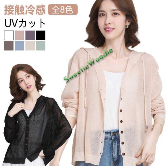 羽織り カーディガン フード付き 夏 カーディガン 冷房対策 ニット 接触冷感 春 薄手 トップス アウター UVカット 長袖 サマー カーデ ニット