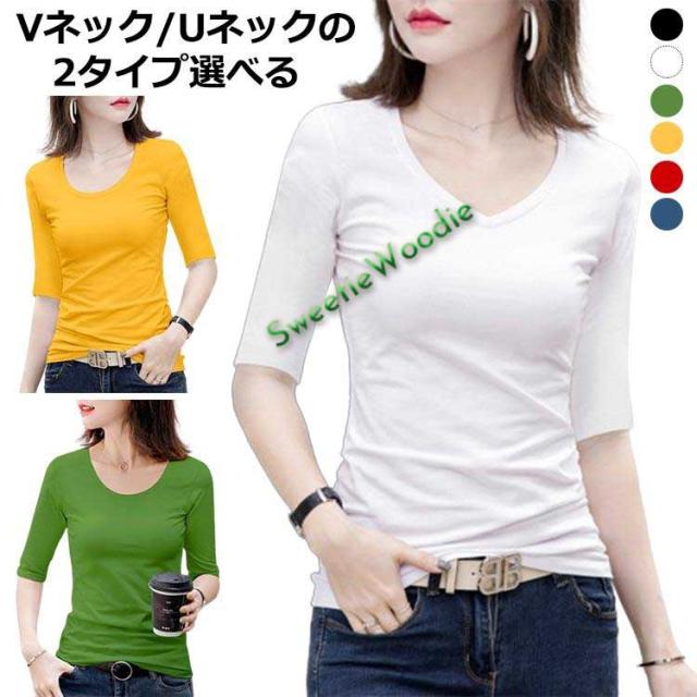 タイト Tシャツ 半袖 五分袖tシャツ 無地 Uネック ストレッチ トップス カットソー 無地tシャツ Vネック レディース 夏 5分袖 タイト 無地