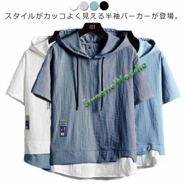 接触冷感 パーカー メンズ 半袖パーカー 半袖 パーカー レイヤード風 フード付きtシャツ プルオーバーパーカー 薄手 切り替え 夏服 涼しい 冷感