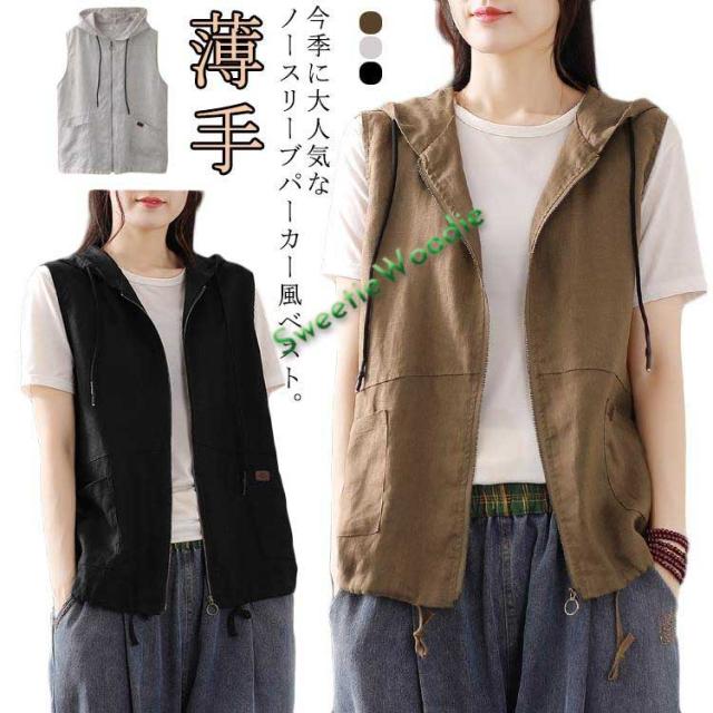 フード付きベスト フード付き ジレ リネンベスト ベスト 綿麻 パーカー ジップアップ ノースリーブ 薄手 レディース 麻 リネンベスト 夏 秋