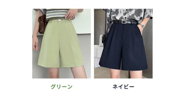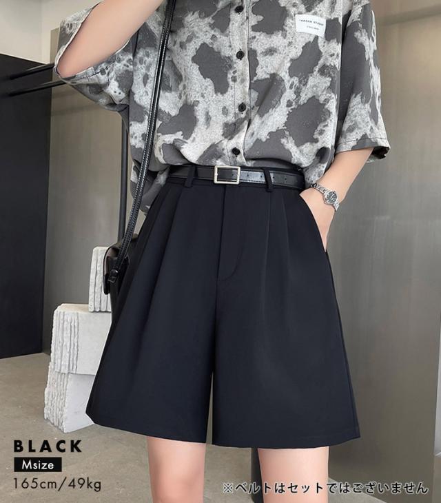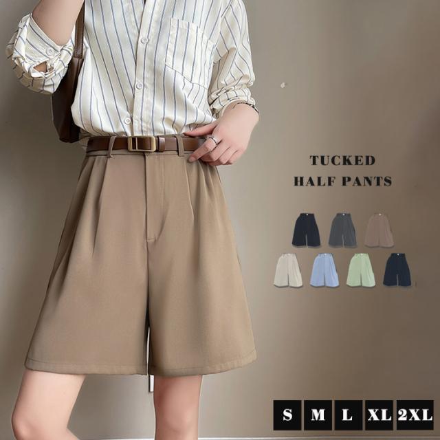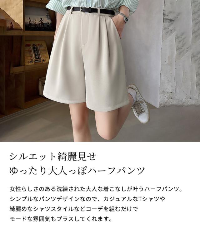 「だぼっときれいに」ハーフパンツ レディース きれいめ ボトムス ひざ上 タック フロント Aライン フレア ゆったり 無地 ツイル生地 ハイウエスト ボタン ファスナー ポケット バックウエストゴム ベルトループ ポケット 薄手 黒 白 春 夏 秋