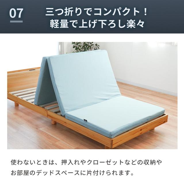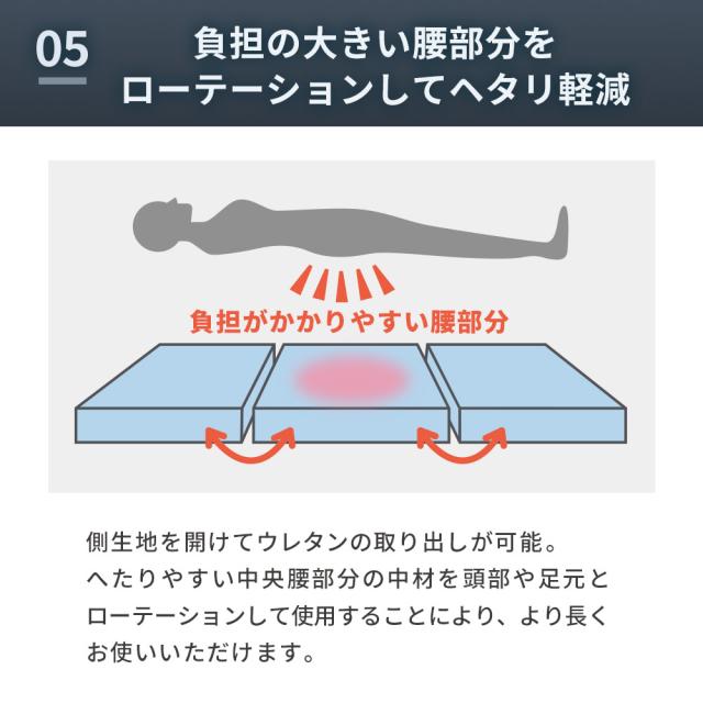 ・高い反発性と弾力性で寝返り促進 “寝返り”には、血流促進や体温調節、日中の活動で歪んだ背骨を調整する働きがあります。 耐久性・弾力に優れたプロファイルウレタンと、通気性抜群の高反発ポリエチレンファイバーの二層構造。 高い弾力性と押し上げる力により全身の体圧が分散されるため、身体の1か所への負担集中を軽減。 カバーはご家庭の洗濯機で丸洗いOK! 側生地ファスナーの開け締めでウレタンの取り出しが可能。 硬質ウレタンと洗えるファイバーを自由に組み合わせ、自分好みの寝心地に調整できます。 ・三つ折りで取り扱い楽々使わないときは、押入れやクローゼットなどの収納やお部屋のデッドスペースに片付けられます。 |
