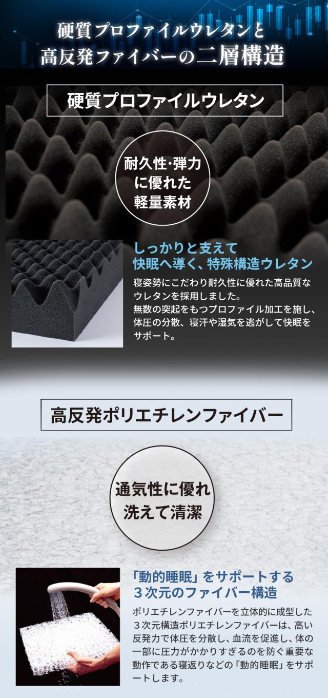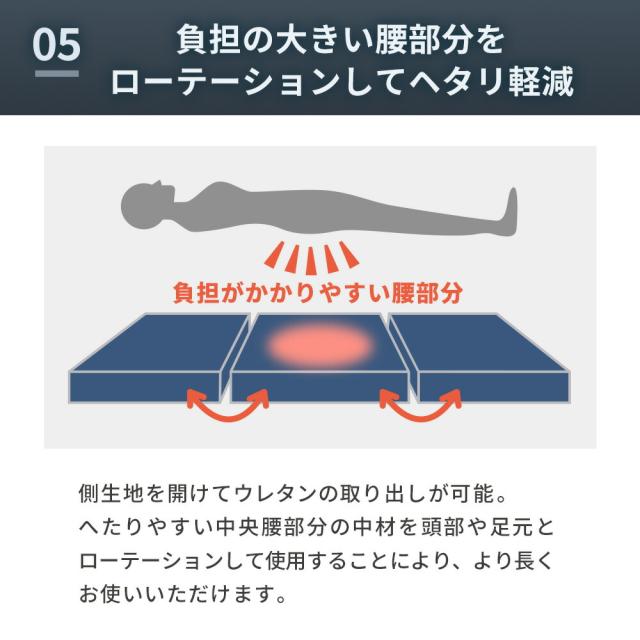 | ・高い反発性と弾力性で寝返り促進 “寝返り”には、血流促進や体温調節、日中の活動で歪んだ背骨を調整する働きがあります。 耐久性・弾力に優れたプロファイルウレタンと、通気性抜群の高反発ポリエチレンファイバーの二層構造。 高い弾力性と押し上げる力により全身の体圧が分散されるため、身体の1か所への負担集中を軽減。 カバーはご家庭の洗濯機で丸洗いOK! 側生地ファスナーの開け締めでウレタンの取り出しが可能。 硬質ウレタンと洗えるファイバーを自由に組み合わせ、自分好みの寝心地に調整できます。 ・三つ折りで取り扱い楽々使わないときは、押入れやクローゼットなどの収納やお部屋のデッドスペースに片付けられます。 | |