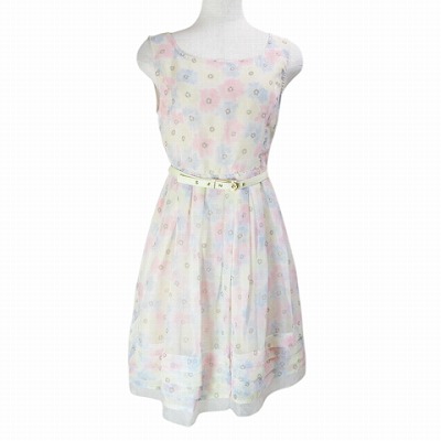 【中古】ロディスポット 美品 シアーワンピース ベルト付き ノースリーブ ひざ丈 花柄 M パステルカラー ピンク ブルー