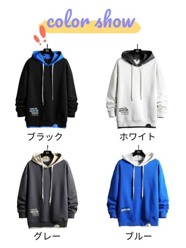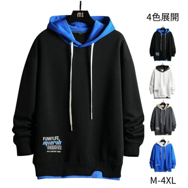 パーカー メンズ トップス 長袖 トレーナー フード付き 重ね着風 レイヤード 英文字 ジャージ スウェット カジュアル 秋 冬 新作