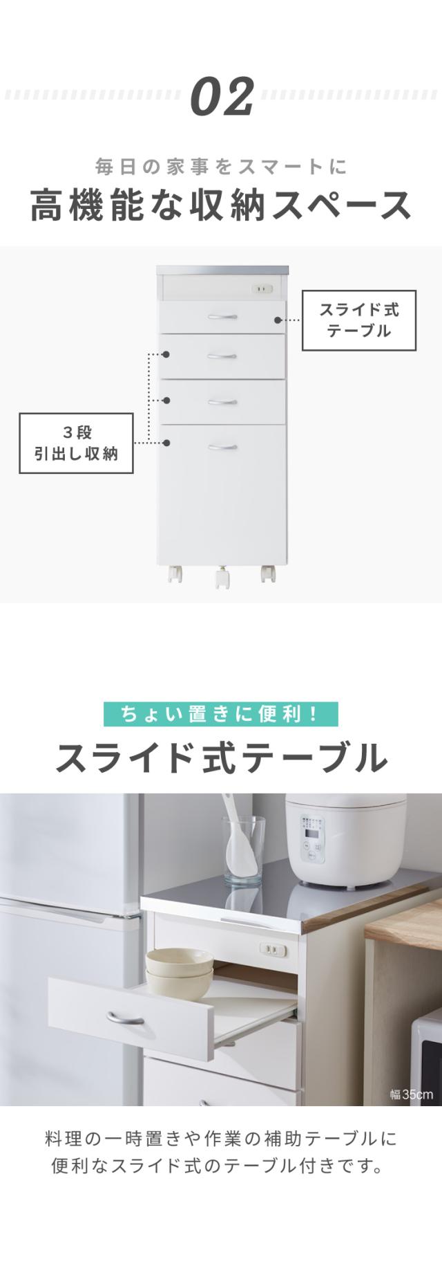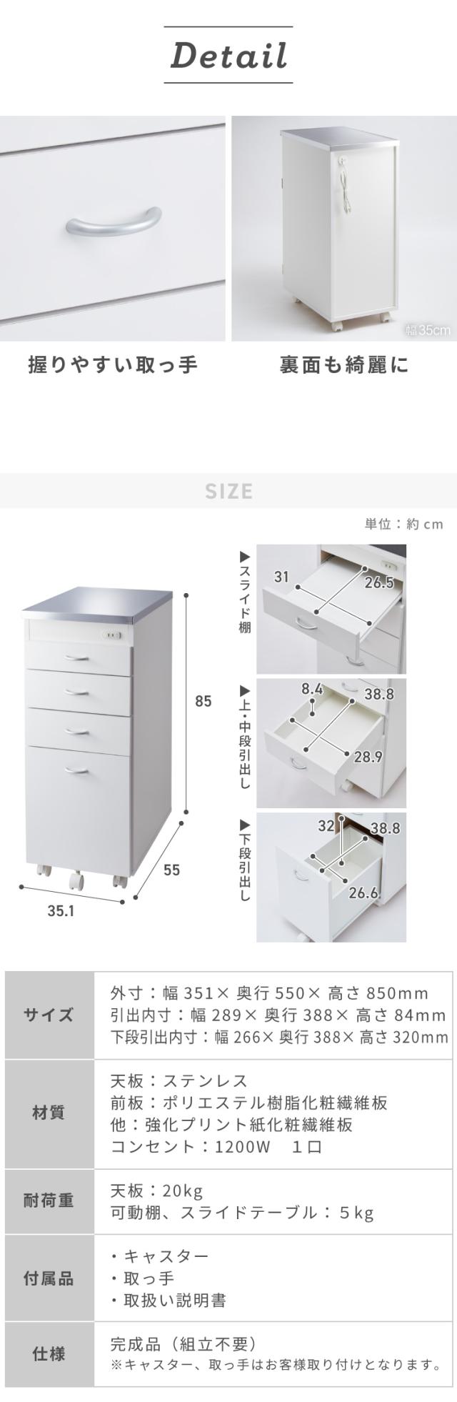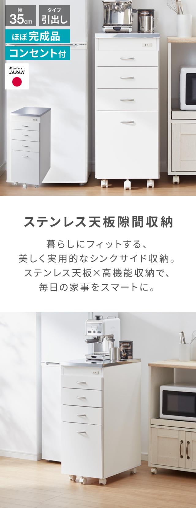 日本製 ステンレス天板 キッチン収納 幅35cm キャスター付き 引き出し4段 スリムチェスト シンク横ラック コンセント付き キャスター付き 隙間収納 スリムラック キッチンストッカー 省スペース【送料無料】
