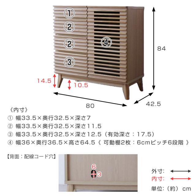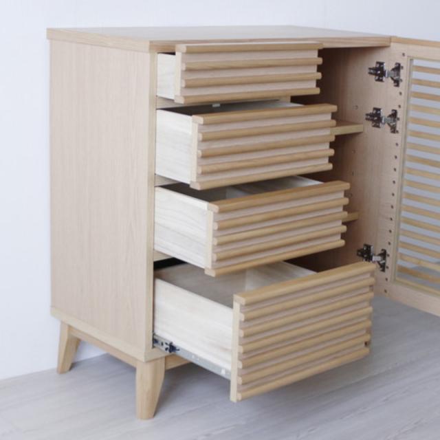 | 材質 | 天板・前板:天然木工芸突板 側板:プリント紙化粧繊維板 ルーバー:無垢 脚:天然木 仕上げ:ウレタン塗装 |