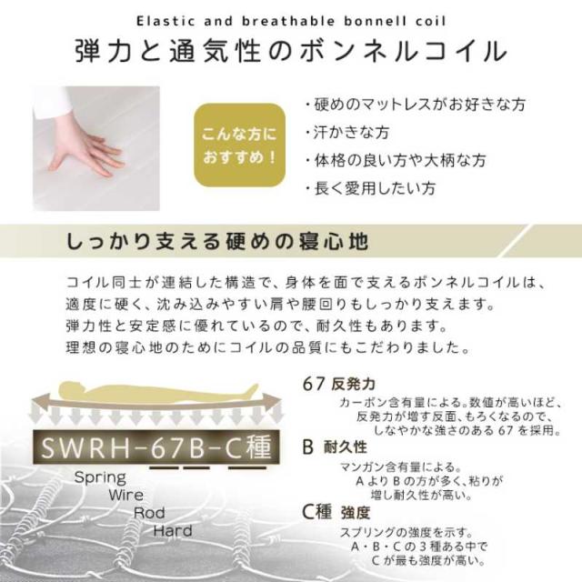 コイル同士が連結した構造のボンネルコイルにより、身体を面で支え、沈み込みすぎず安心した寝心地を実現します。