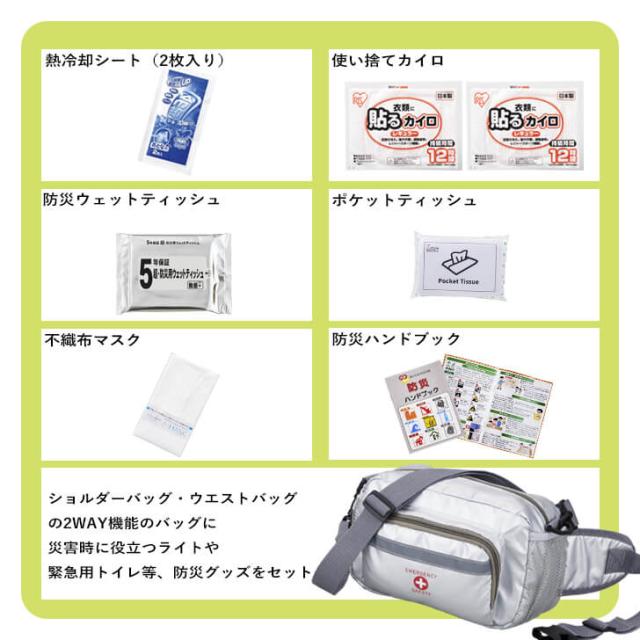 ショルダーバッグ・ウエストバッグの2WAY機能のバッグに災害時に役立つライトや緊急用トイレ等、防災グッズをセットした一人用防災セット。