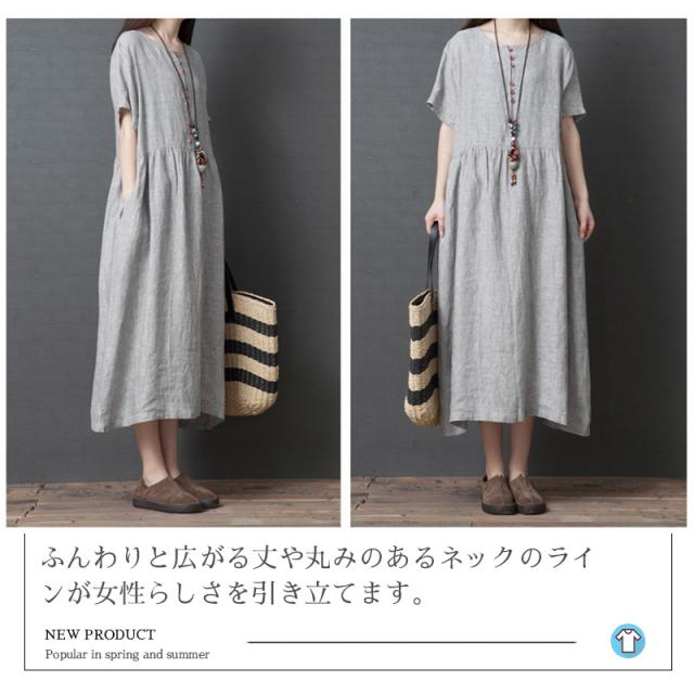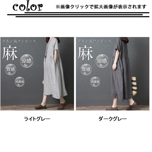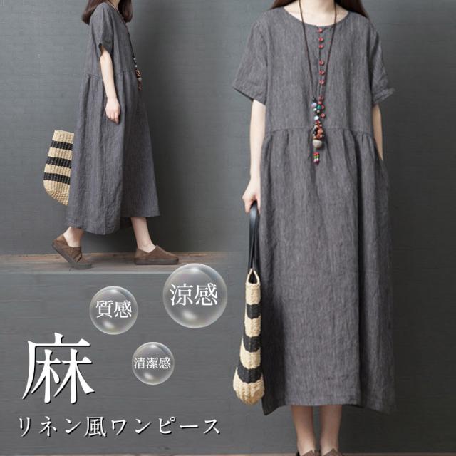 ワンピース リネン風 レディース 春 夏 麻 ワンピース 綿麻 ロング 半袖 ワンピース 体型カバー ネイビー 麻色 40代 着痩せ シンプル