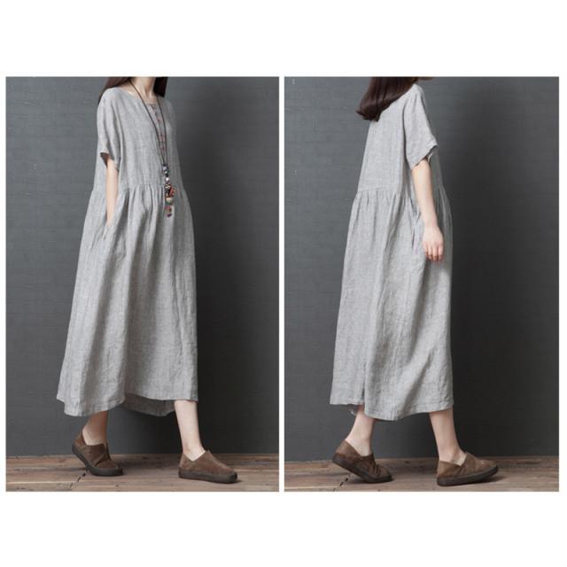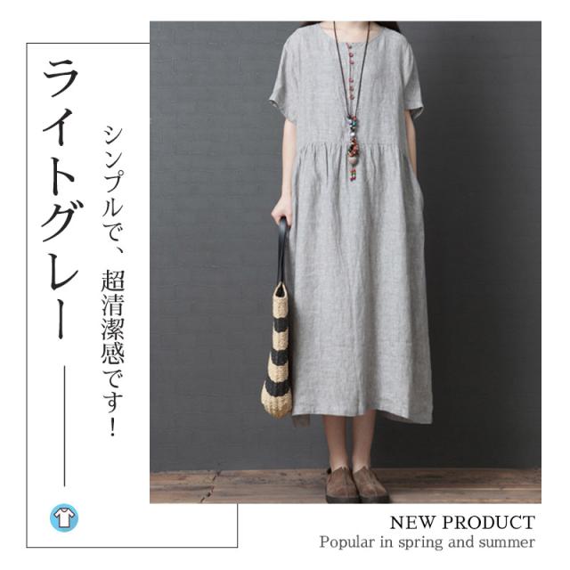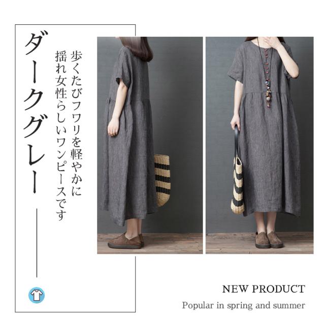 【キーワード】リネン風ワンピース レディース 春 夏 麻 ワンピース 綿麻 ロング 半袖 ワンピース 体型カバー ネイビー 麻色 40代 着痩せ シンプル 20代 30代 40代 50代 60代 ゆったり 清潔感 涼感 プレゼント