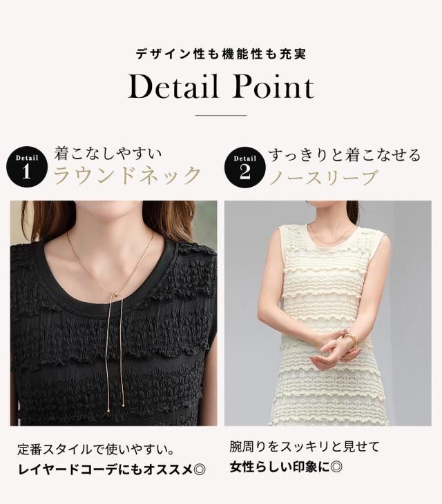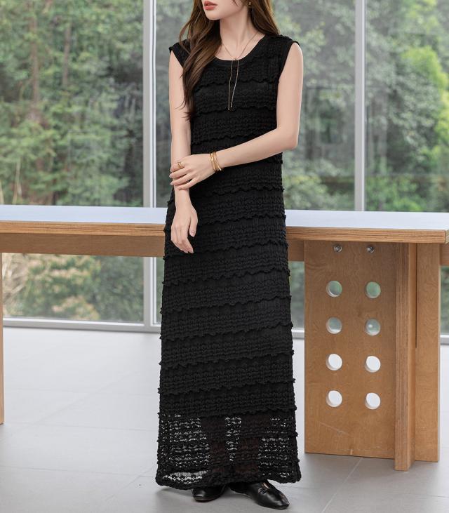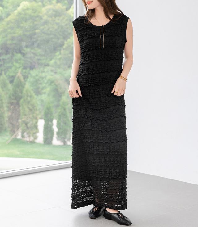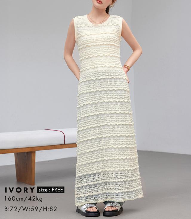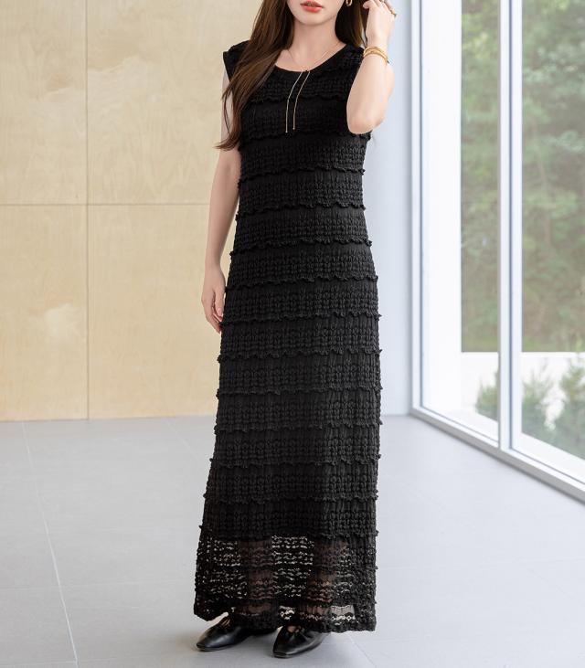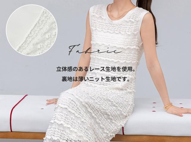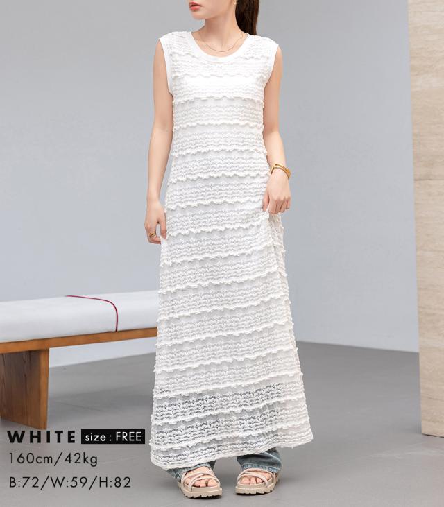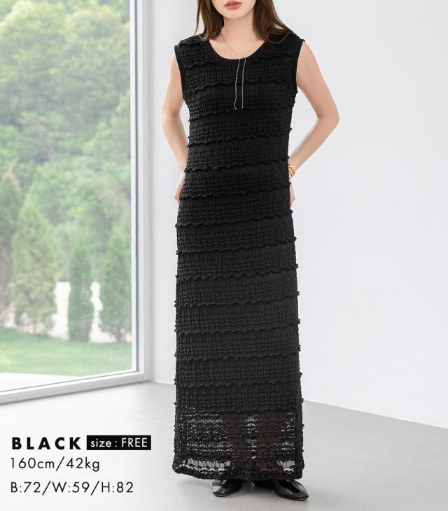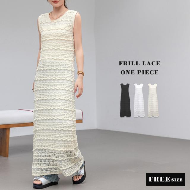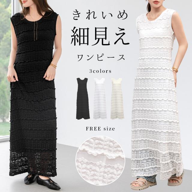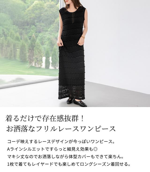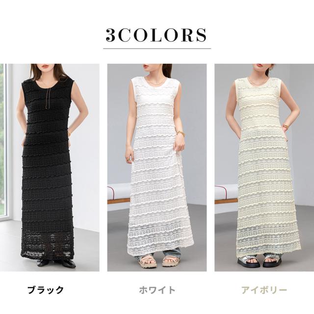 「レイヤードが似合う透け感」ワンピース レディース ロング マキシ丈 きれいめ フリル レース 立体感 透け感 裏地付き ひざ下まで ノースリーブ 袖なし Aライン ロングワンピース 伸縮性 プルオーバー 体型隠し ラウンドネック 薄手 黒 白