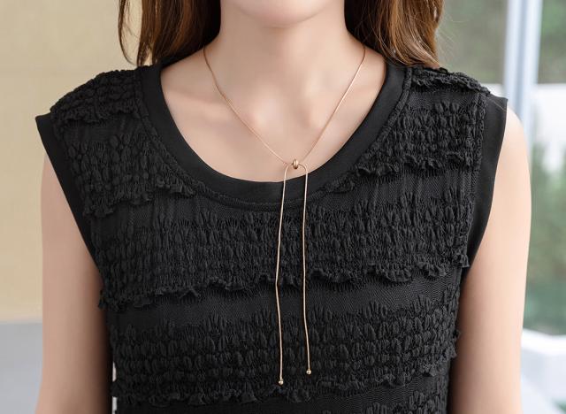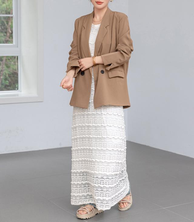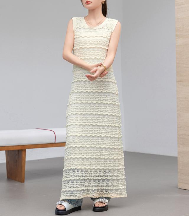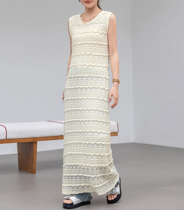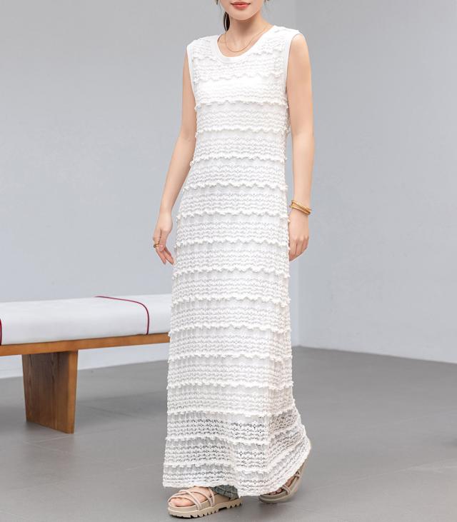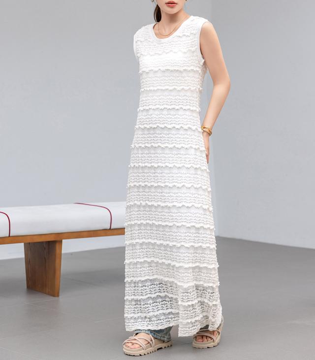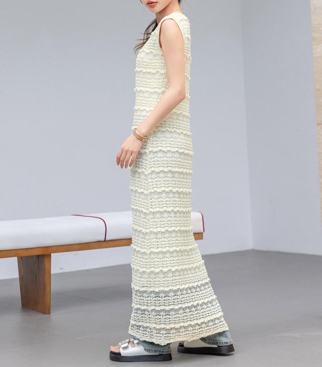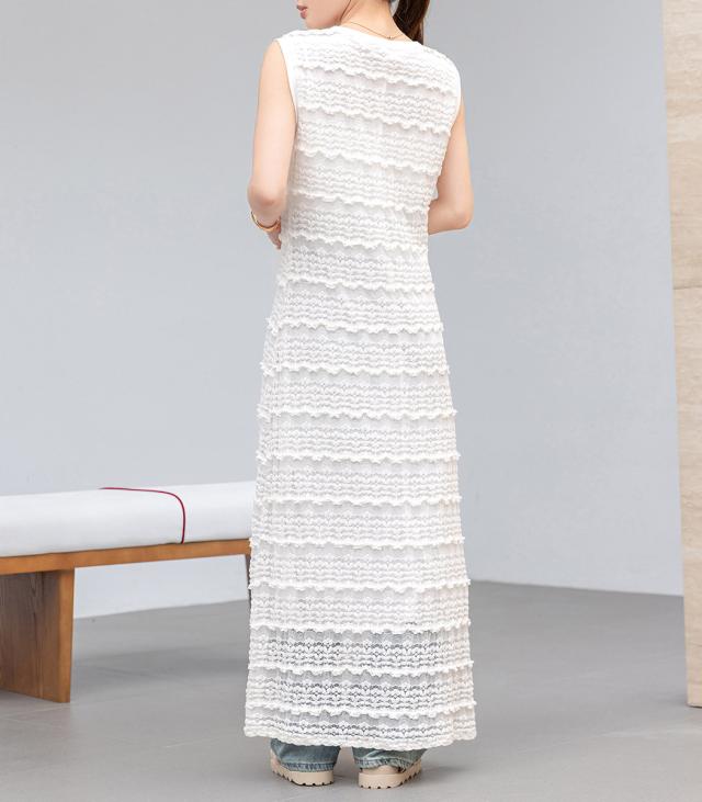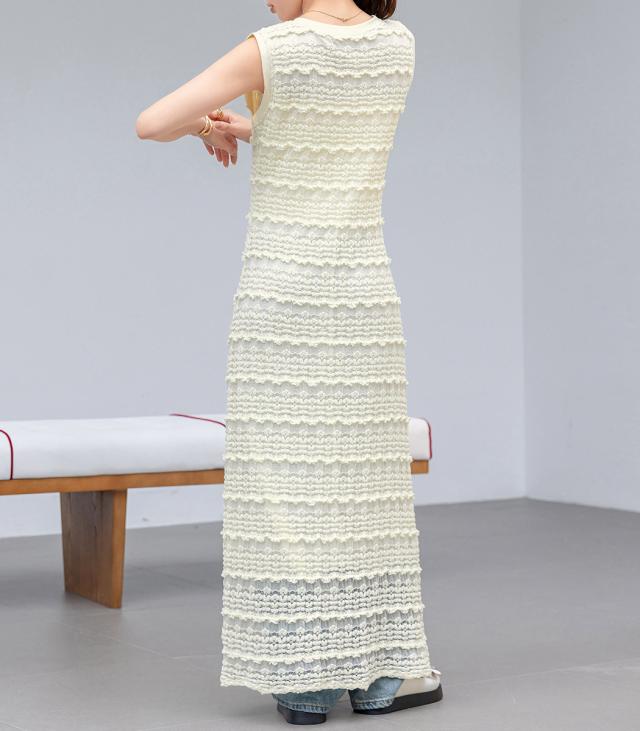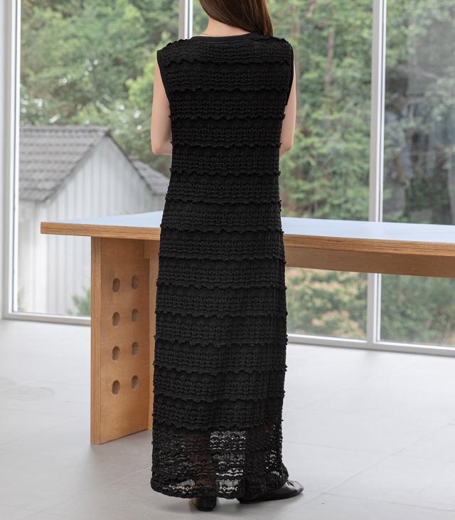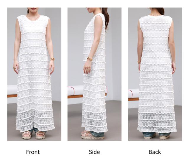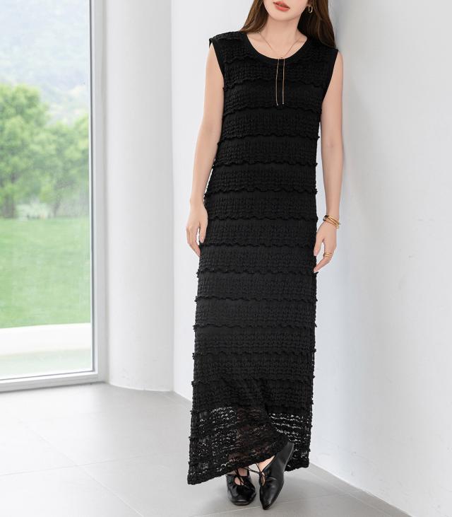 「レイヤードが似合う透け感」ワンピース レディース ロング マキシ丈 きれいめ フリル レース 立体感 透け感 裏地付き ひざ下まで ノースリーブ 袖なし Aライン ロングワンピース 伸縮性 プルオーバー 体型隠し ラウンドネック 薄手 黒 白