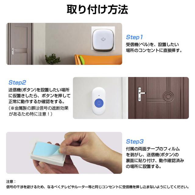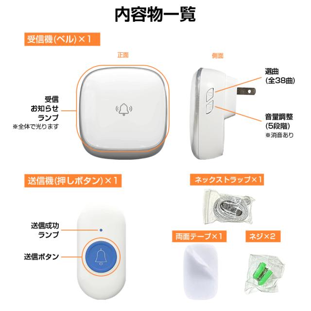 内容物:受信機(ベル)×1、送信機(ボタン)×1、ストラップ、両面テープ、ネジ、説明書,