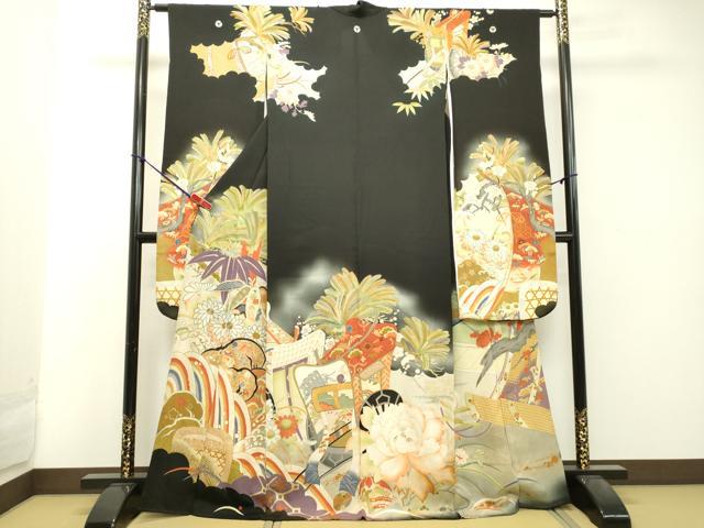 平和屋着物●アンティーク 大正ロマン 振袖 背抜き仕立て 駒刺繍 立波御所車宝尽くし花文 暈し染め 黒地 金彩 正絹 逸品 DAAT1407tw