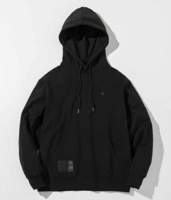 フェイクレザーに箔押しでブランドロゴを刻んだオリジナルのパッチがアクセントのセットアップ。