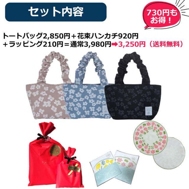 ★限定ギフトセット★ マチ付きトートバッグ+ハンカチ+ラッピング付き★ バッグ トートバッグ パフィフラワー 小さめ 敬老の日 レディース マチ付き シフォン 花柄 ランチバッグ おしゃれ レース 花 もこもこ お散歩 サブバッグ フラワー マチ有 かわいい プチギフト 通勤