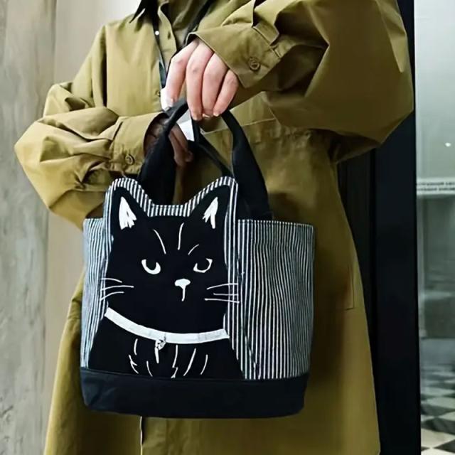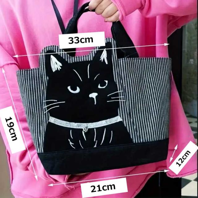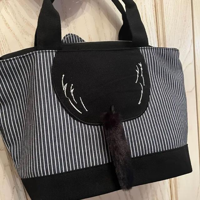 【送料無料】レディースバック プレゼント ギフト ストライプ 可愛い オススメ お弁当 通勤 通学 旅行 お出かけ ミニトート 便利 厚手 マチ有 猫型 シッポ付き クロネコ ネコ キャット