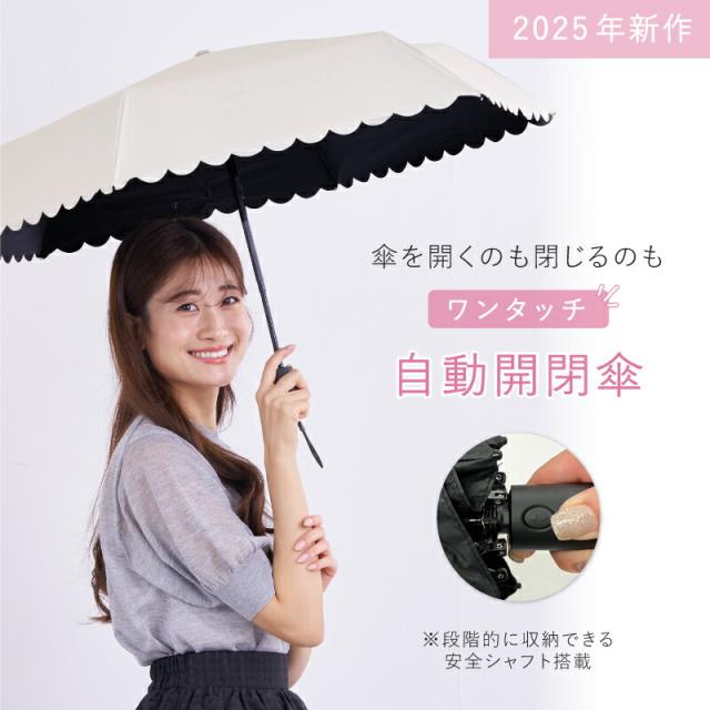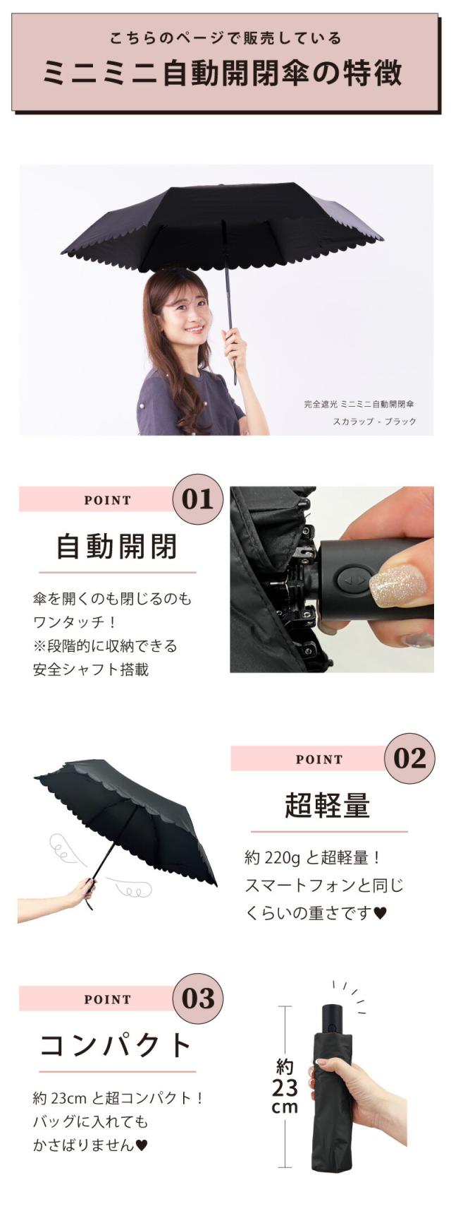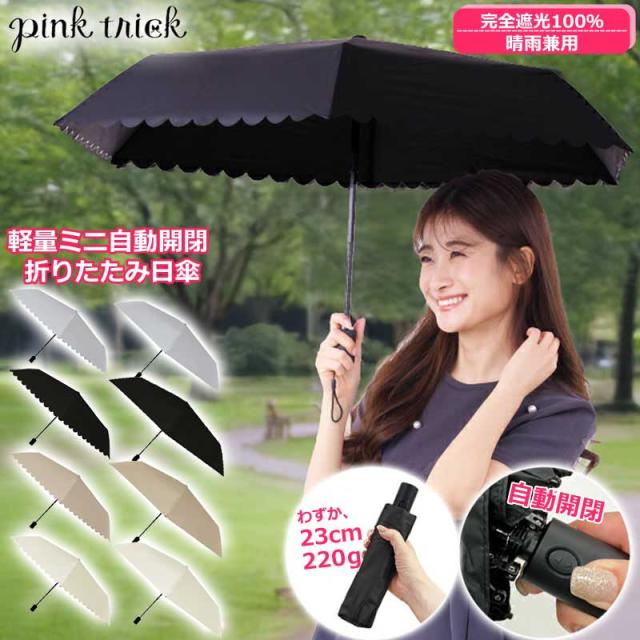 日傘 完全遮光 ミニ自動開閉傘 pink trick 軽量 折りたたみ ワンプッシュ親骨50cm 遮光率100% 紫外線 UVカット 晴雨兼用 傘 丈夫 1級遮光 遮熱効果 大人 コンパクト 自動 万博 ジャンプ ワンタッチ シンプル スカラップ ピンクトリック ー15℃