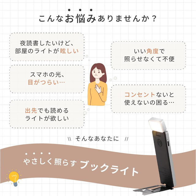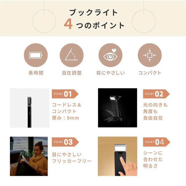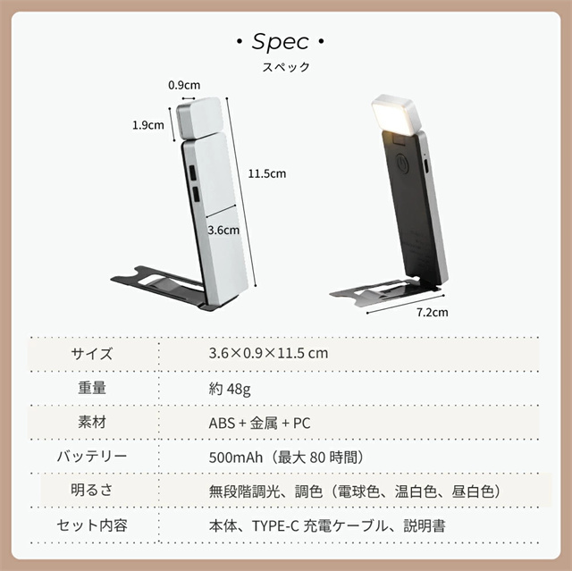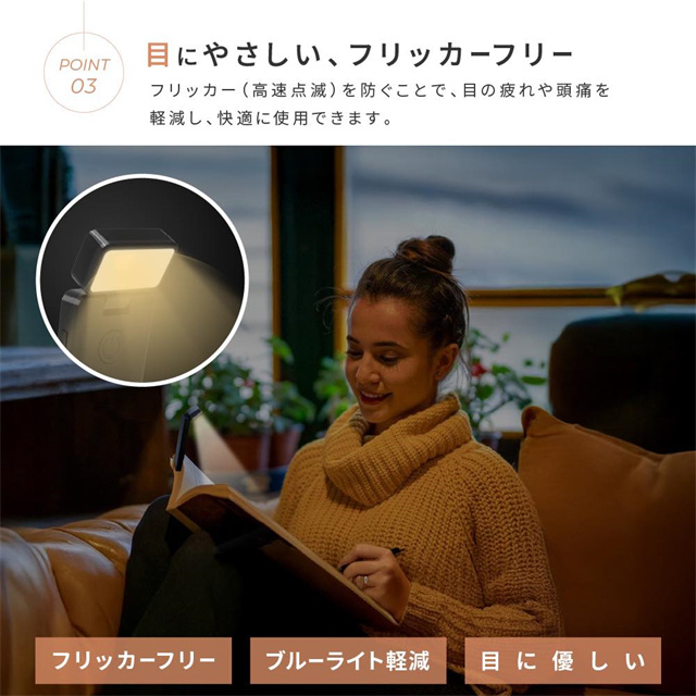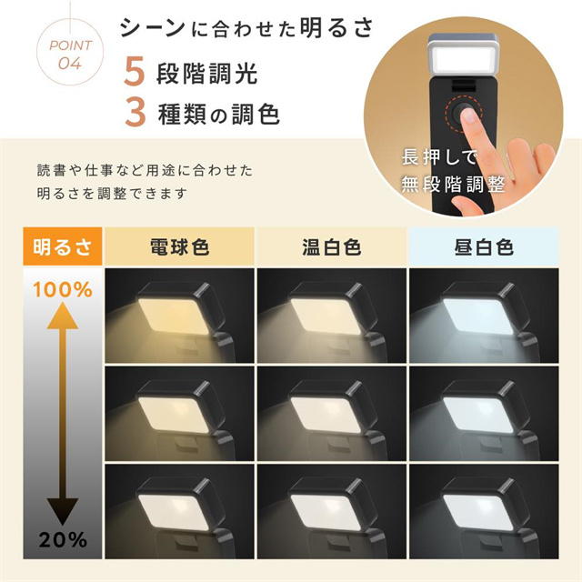 ◆おすすめポイント ・やさしい光で目に優しいフリッカーフリー仕様 ・最大80時間連続使用可能なロングバッテリー ・無段階調光+3段階調色で理想の明るさに調整可能 ・コンパクト&折りたたみ式で持ち運びラクラク ・USB充電式&コードレスでどこでも使える ・クリップ式で本や机にしっかり固定、角度も自由自在 ◆使用用途 ・読書灯やベッドライトとして ・在宅ワークや学習用ライトに ・アウトドアや旅行の携帯ライトとして |