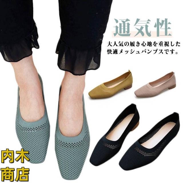 スクエアトゥ パンプス レディース サマーシューズ 夏 メッシュ シンプル ニット ローヒール シューズ フラットシューズ 美脚 メッシュパンプス 無地 通気性 ぺたんこ 蒸れない 快適 メッシュパンプス オフィス 浅口 フラットパンプス