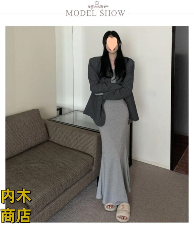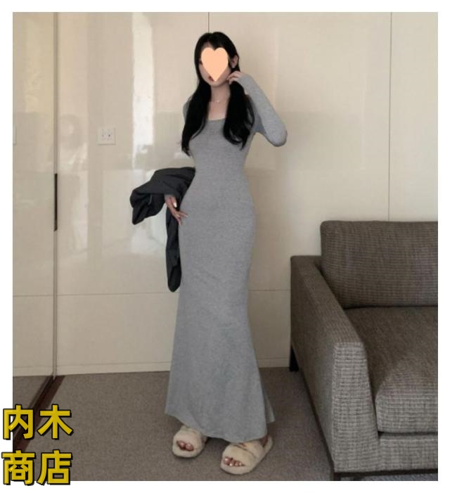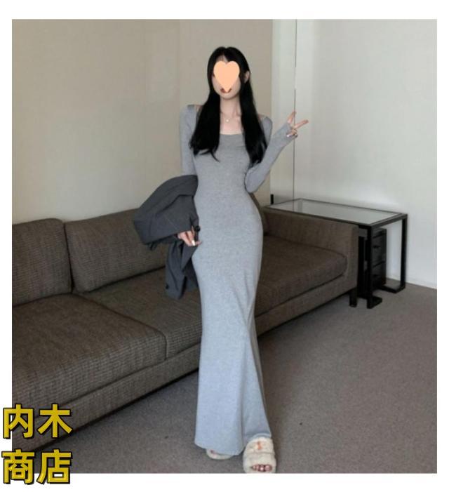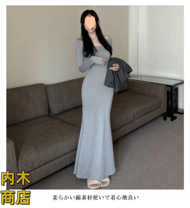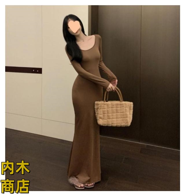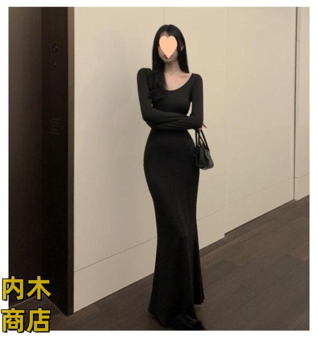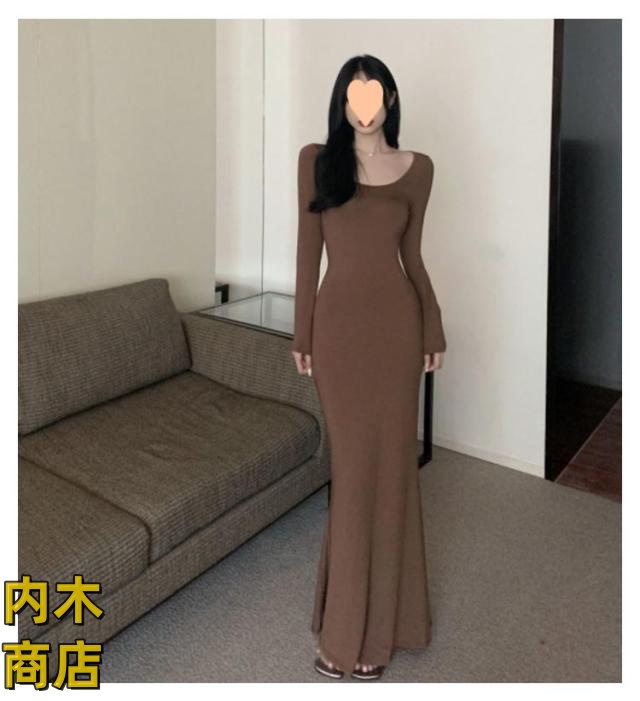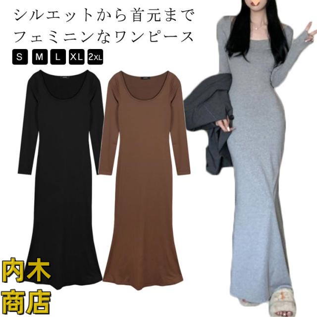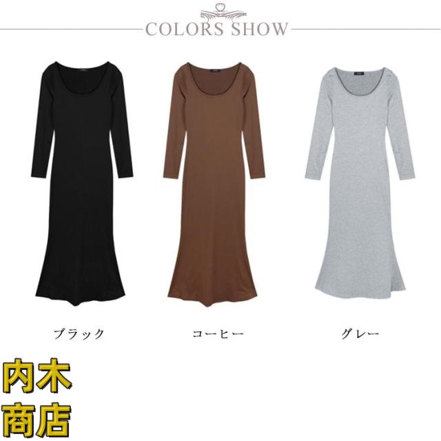送料無料 レディース 春 夏 韓国ファッション マーメイド 長袖 ワンピース 黒 春秋 ロング丈 タイト スリムフィット マーメイドワンピース グレー シンプル ブラック コーヒー ワンピース カジュアル フレアヘム 無地