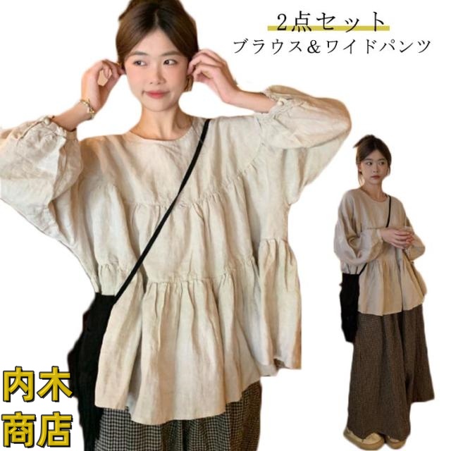 スーツ ブラウス シャツ セットアップ リネン風 秋冬 チュニック 2点セット 体型カバー 冬 着痩せ きれいめ パンツ トップス パール付き袖 長袖 カジュアル 可愛い 透けにくい レディース 春 ライン 入学式 チェック 秋 着痩せ