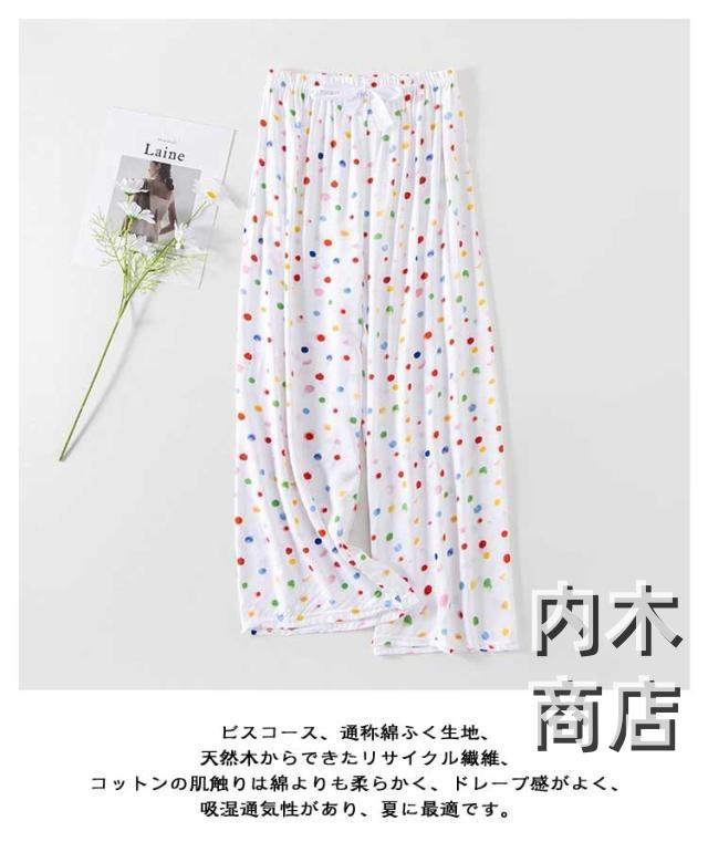 | ゆったりシルエットで、ひざが隠れる丈感のルームパンツです。 春秋はもちろん、夏用のパジャマとしても活躍してくれます。 リラックスタイムにぴったり♪ 通気性がよく涼しい。女性らしいカラフルなカラーと柄がオシャレ。 ビスコース、通称綿ふく生地、天然木からできたリサイクル繊維、コットンの肌触りは綿よりも柔らかく、ドレープ感がよく、吸湿通気性があり、夏に最適です。 | |