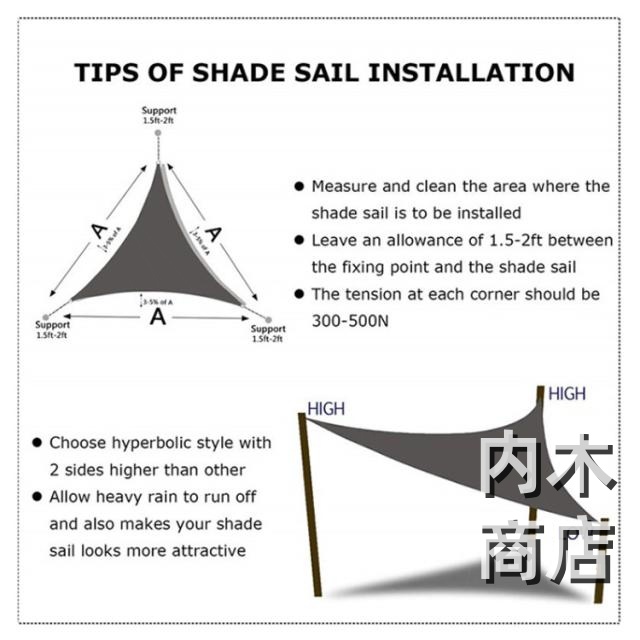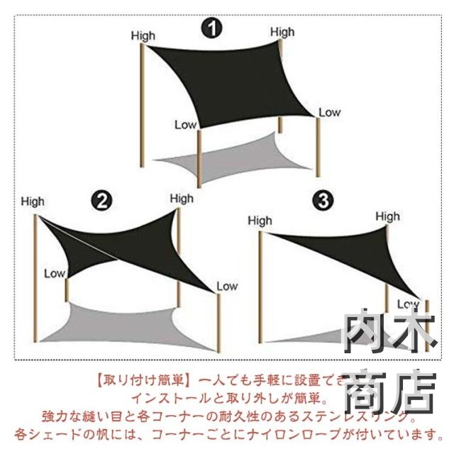 | 【抜群のUVカット】紫外線を約98%カットして、お客様を守ってくれます。直射日光を遮ると同時に適度な風通しもあり、家の雰囲気が良くなっています 。 【高品質の素材】耐久性に優れた高密度ポリエステルを採用して、撥水性能はとてもいいです。形状記憶加工を施し、変形や色褪せしにくい、美しい外観を保ちます。 【取り付け簡単】取り付けはロープで縛るだけです。付属のロープを必要な長さにカットして、簡単、安全、自由自在にシェードをお取付けます。 【様々な場所に対応】キャンプ、登山、海辺、庭先、玄関、天台、野外活動、駐車場など様々なところで利用できます。収納用の袋つきなので持ち運びも便利です。 【取り付け簡単】一人でも手軽に設置できる、インストールと取り外しが簡単。 強力な縫い目と各コーナーの耐久性のあるステンレスリング。 各シェードの帆には、コーナーごとにナイロンロープが付いています。 【様々な場所に適用】庭、ガーデン、パティオなどで、家族や友人に涼しい色合いを提供します、キャンプピクニックなど、 屋外で過ごすときに太陽から身を守るのに最適です。 | |
